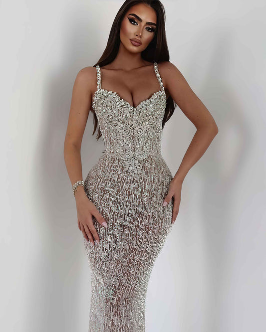 Silver Crystal Corset Mermaid Gown with Detachable Gloves
