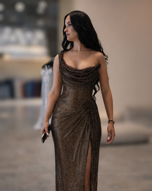 Chocolate Brown Shimmer Draped Fitted Evening Gown