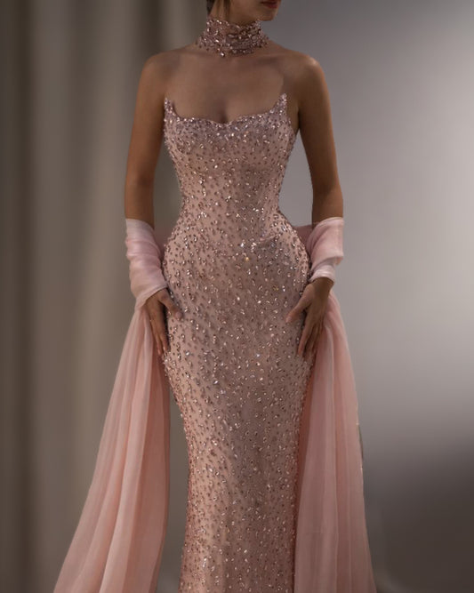Crystal Beaded Corset Column Gown with Feather Cuffs