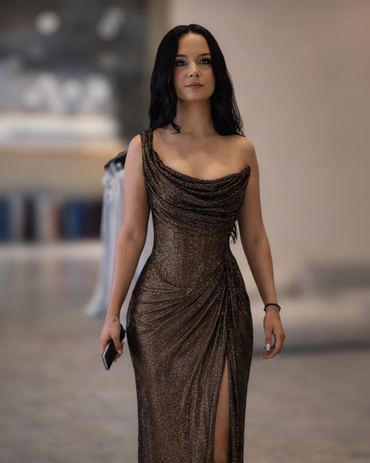 Chocolate Brown Shimmer Draped Fitted Evening Gown