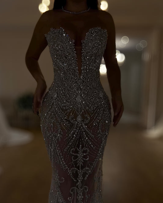 Silver Crystal Corset Mermaid Gown with Detachable Gloves