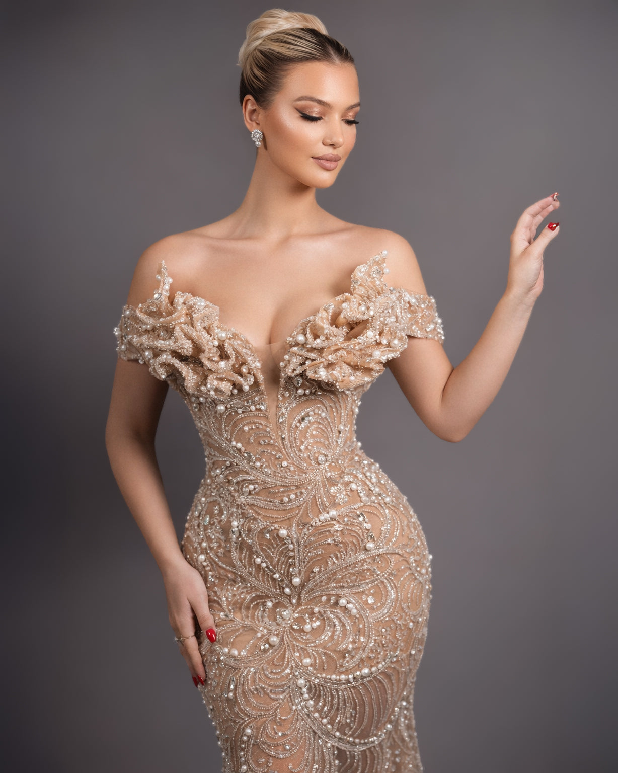 This champagne crystal corset dress is designed to sculpt the body with precision and refined elegance. Crafted with a structured corset bodice, it defines the waist beautifully while providing a secure, flattering fit through the bust and torso. The off-shoulder neckline is elevated by sculpted floral appliqués, adding couture depth and architectural detail to the design.