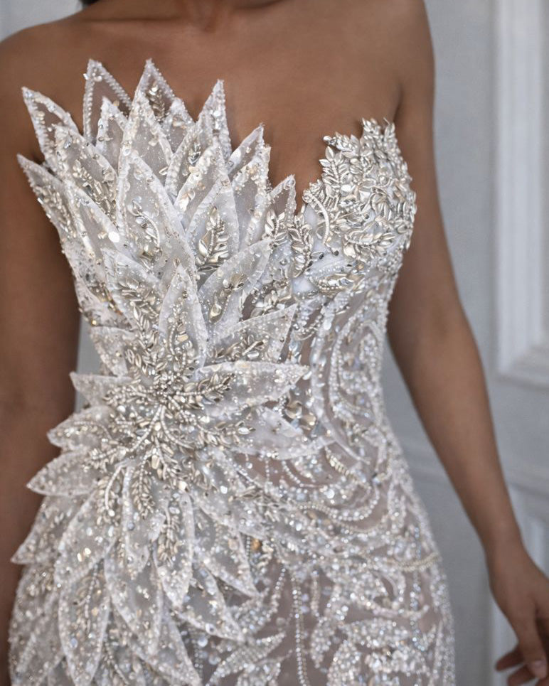 This ivory crystal strapless bridal dress is a couture statement designed for the modern bride who wants elegance with impact. Featuring a sculpted strapless bodice, the dress is adorned with intricate crystal and bead embroidery arranged in a dramatic, leaf-inspired pattern that radiates from the waist. The sheer illusion base enhances the craftsmanship while maintaining a refined, luxurious finish. An asymmetrical silhouette with a high slit and flowing train adds movement and contemporary sophistication, creating a striking balance between romance and high fashion. Custom made for a flawless fit, this dress is designed to leave a lasting impression on your most unforgettable day.